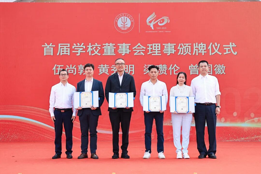 校庆庆典上,“聚力”篇章的校董会理事颁牌仪式成为焦点。顺德区侨联、杏坛镇主要负责人为首届校董会理事颁发聘书,伍氏家族成员代表伍尚敦、校友会副会长黄秀明、杏坛总商会会长梁瓒伦及学校党总支书记曾国徽共同当选理事。