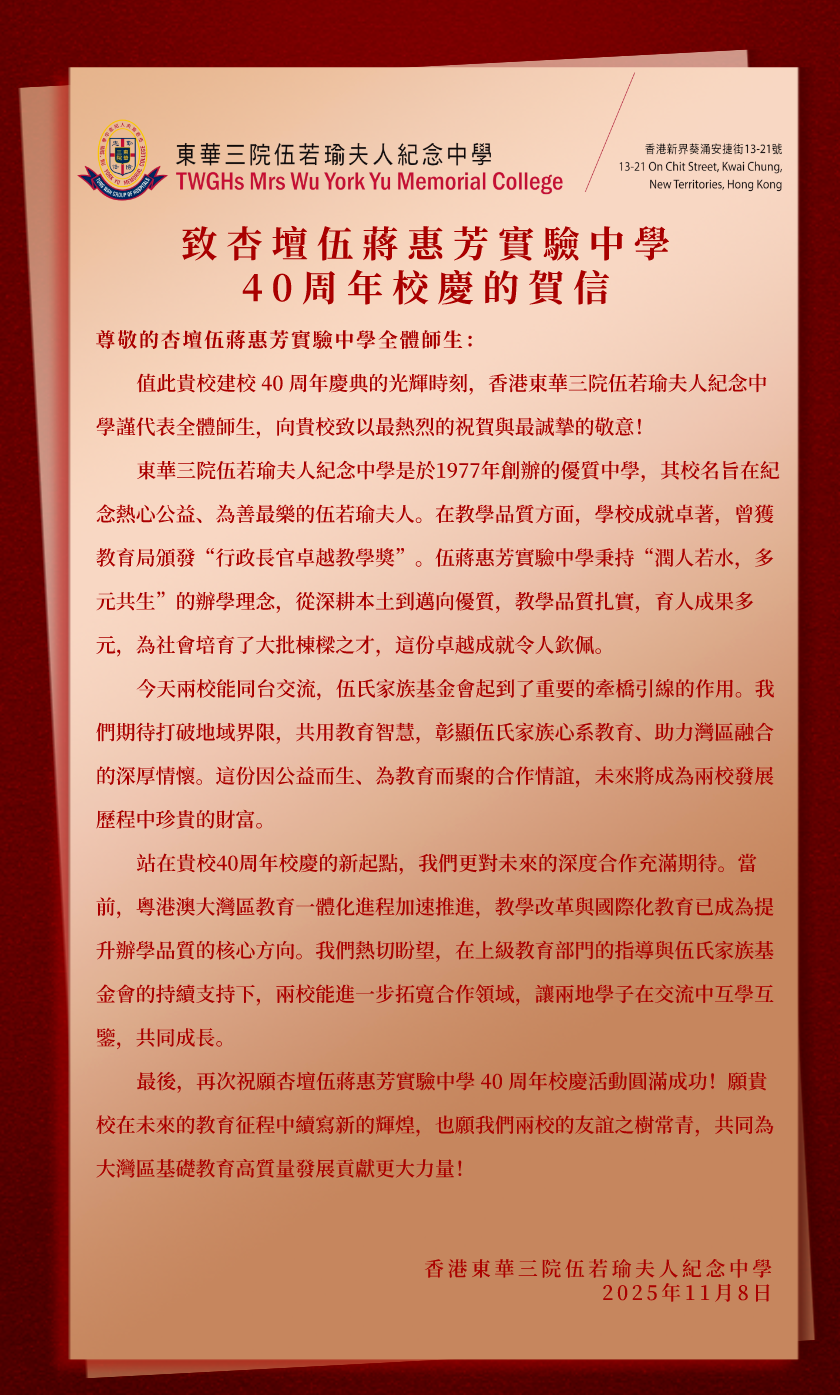香港东华三院伍若瑜夫人纪念中学致杏坛伍蒋惠芳实验中学40周年校庆的贺信