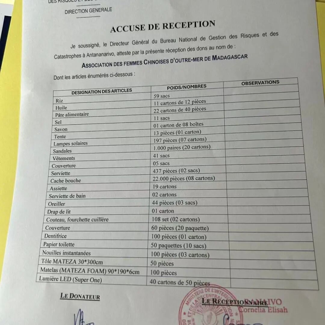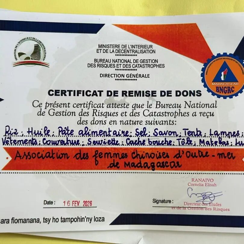 Le 16 février, l'association a remis ces dons au Bureau National de Gestion des Risques et des Catastrophes (BNGRC) de Madagascar lors de la cérémonie de remise officielle.